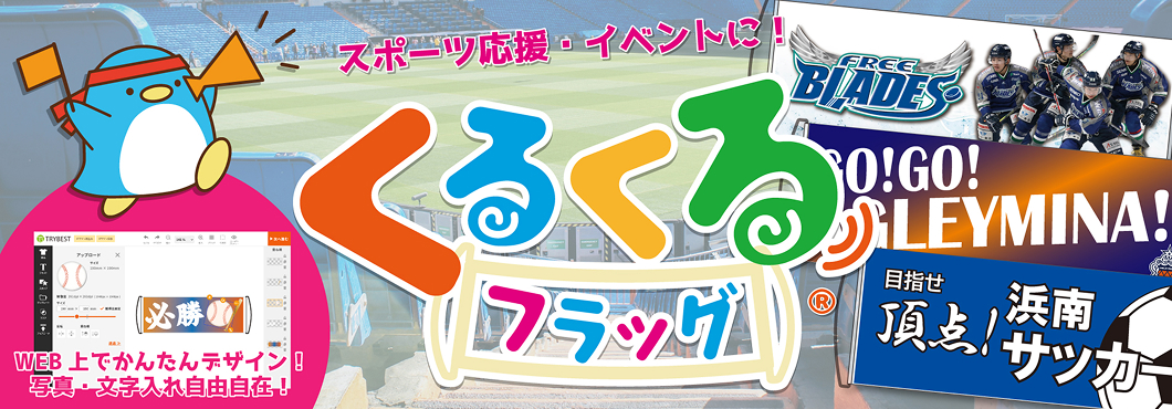 商標登録済み!”くるくるフラッグ ” はコンパクトなのに、ひろげて大きく目立つ!新しいカタチのフラッグです。